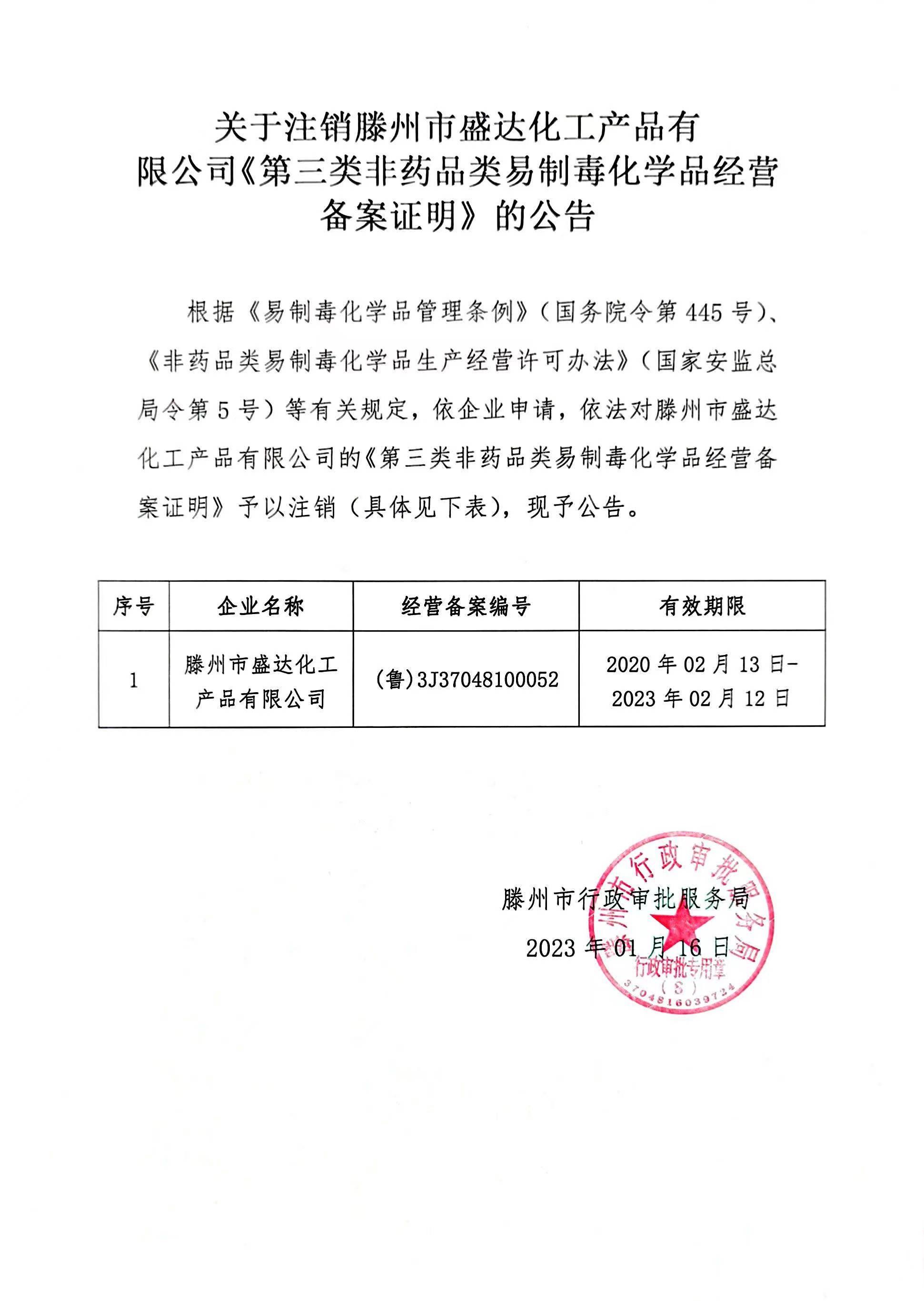 滕州市行政审批服务局依法对滕州市盛达化工产品有限公司《第三类非药品类易制毒化学品经营备案证明》注销公告
