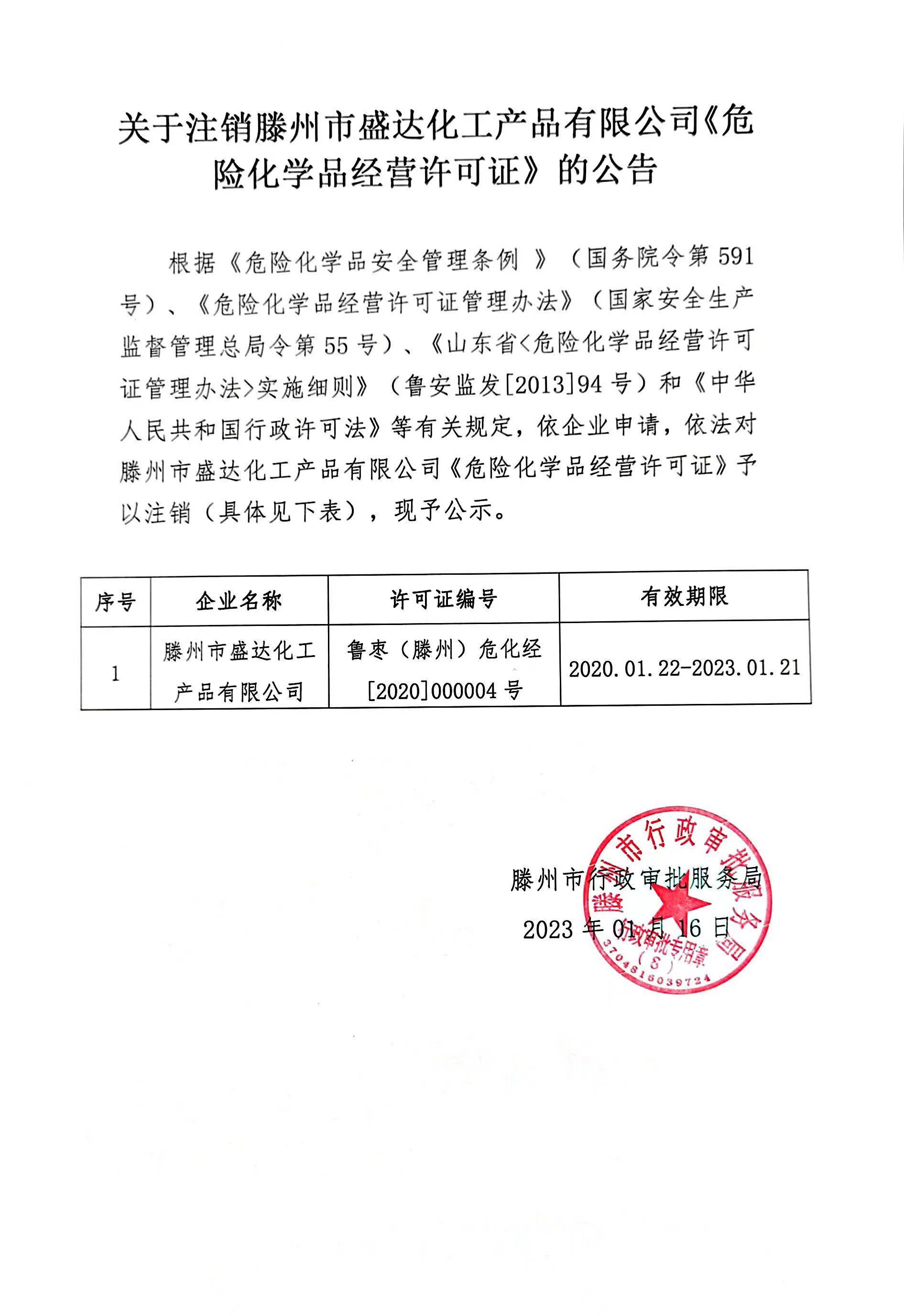 滕州市行政审批服务局依法对滕州市盛达化工产品有限公司《危险化学品经营许可证》注销公告